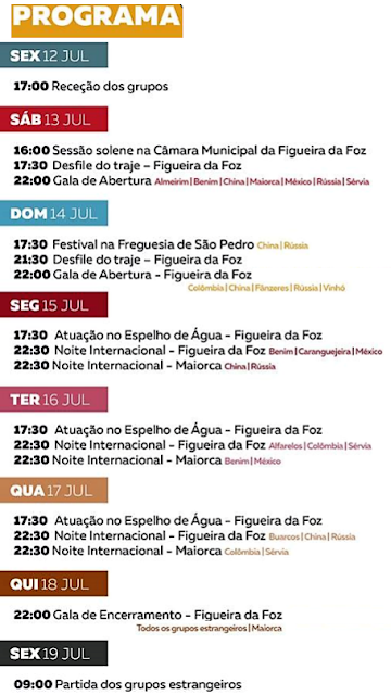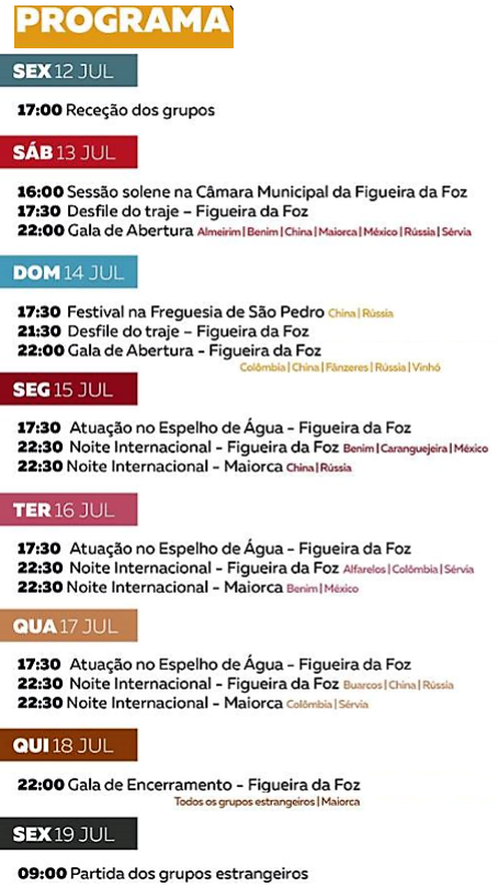 Os grupos folclóricos vão atuar no Terreiro do Paço em Maiorca (13-17 julho), na 'Preguiça' na Figueira da Foz (14-18 julho), e na Freguesia de São Pedro.